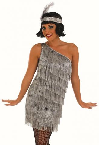 Silver Flapper costume includes a silver one shoulder dress with fringe detailing. Also included is a silver sequin headband with feather.