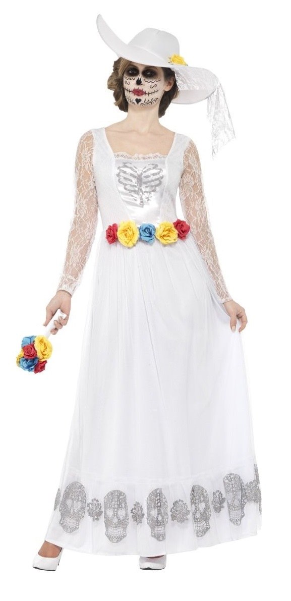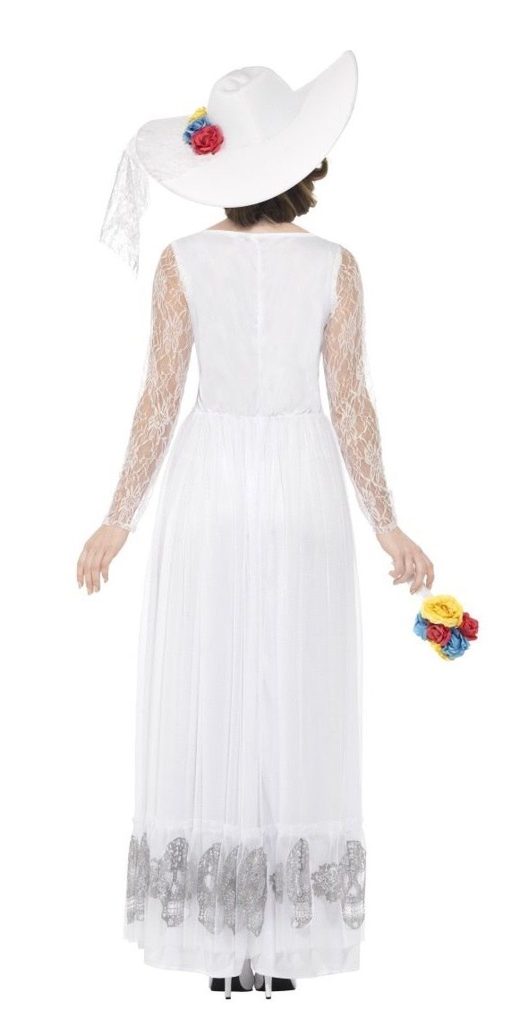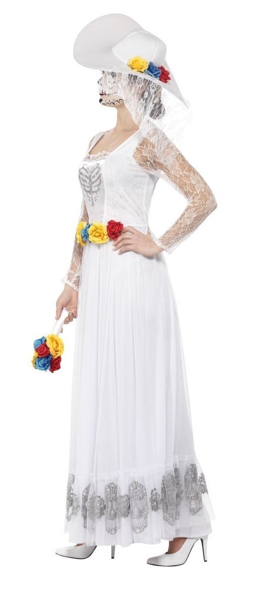 Day of the Dead Skeleton Bride Costume includes a long white lace dress with lace sleeves, flower detail and skeleton print. Costume also includes a hat with lace and flower detail.