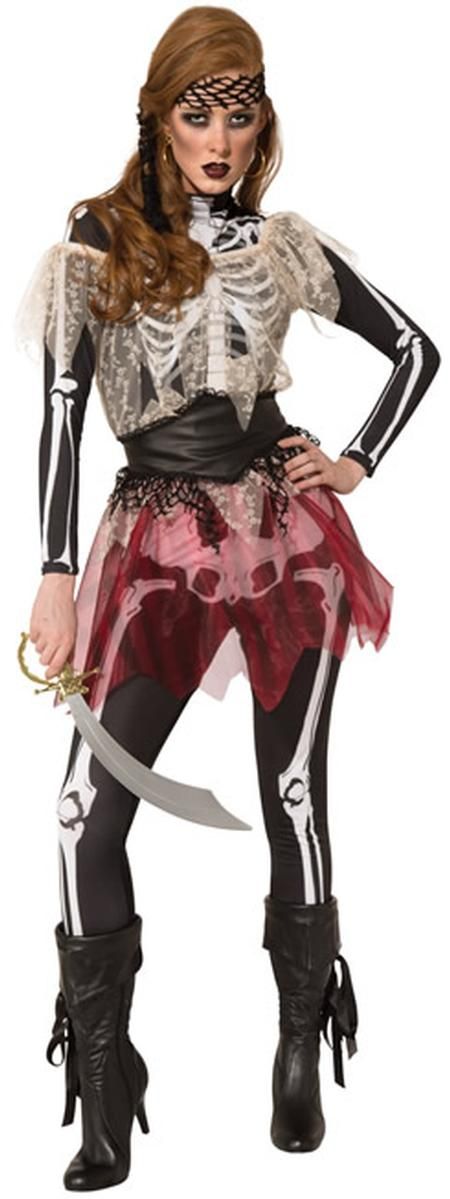 Skellie Pirate Wench Costume includes a long sleeved back top with printed bones and rib cage and a pair of matching leggings. Also included is a mesh skirt with an elasticated waist.