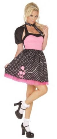 The 3 piece costume includes a alter neck dress with a baby pink top with a black trim. The skirt flares out for a flattering style and has a polka dot design with a poddle image with a silver sequence. The skirt has a pink petticoat on show for a more girlie look.