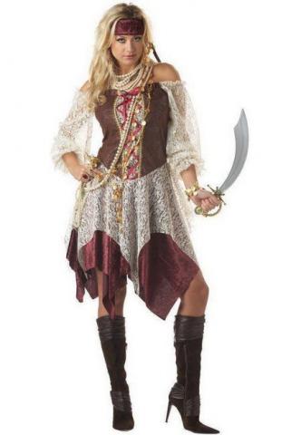 South Seas Siren Costume consists of a dress with cream lace sleeves, brown bodice with gold trimming and wine coloured ribbon to lace up the front. The skirt of the dress is burgundy coloured with a jagged hem with an overlying layer of lace.