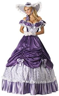 Southern Belle Costume consists of a stunning full-length off the shoulder satin and lace gown, hoop petticoat, lace gloves and is finished off with a very detailed lace hat.