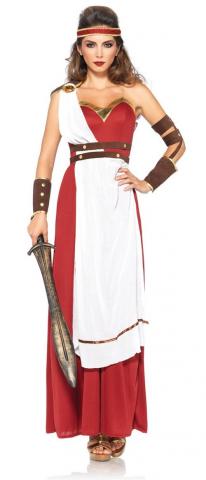 Spartan Goddess costume includes a long dress with cross body apron and attached belt. Also included are a pair of arm wraps.