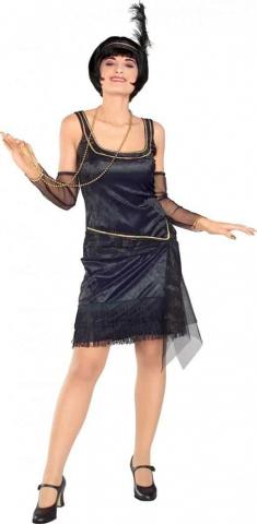 The Speak Easy Flapper Costume includes black tassled flapper dress with gold trim, glovelettes, and headband with feather.