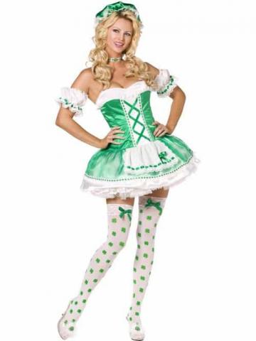 The St Patrick's Babe Ensemble includes 5 pieces: white mini dress, green satin and white lace corset with attached apron, puff sleeves, satin bonnet and choker.