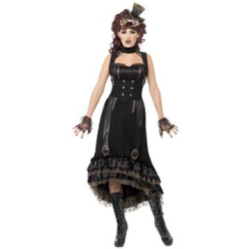 Steam Punk Vamp Costume is a Black Dress With Mock Waist Cincher and Buckle Detail.