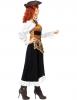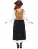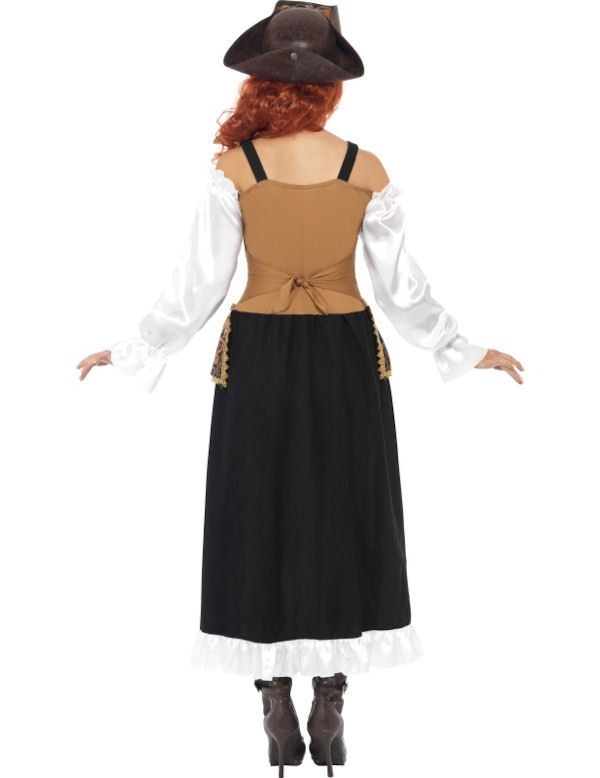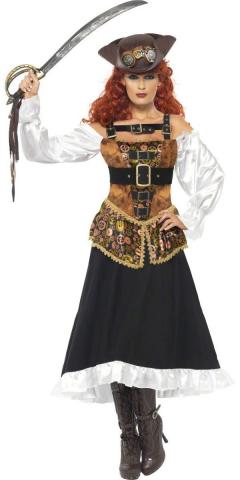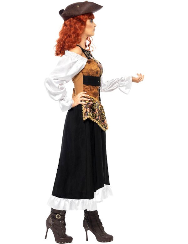 Steampunk Pirate Wench Costume includes a pirate dress with a black and white skirt, white faux silk sleeves and a brown top. The bodice of the dress is printed with multicoloured cogs and is decorated with gold braiding, gold buckles and black straps.