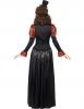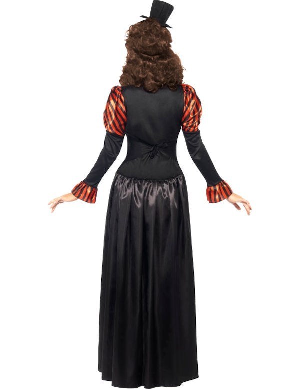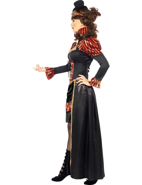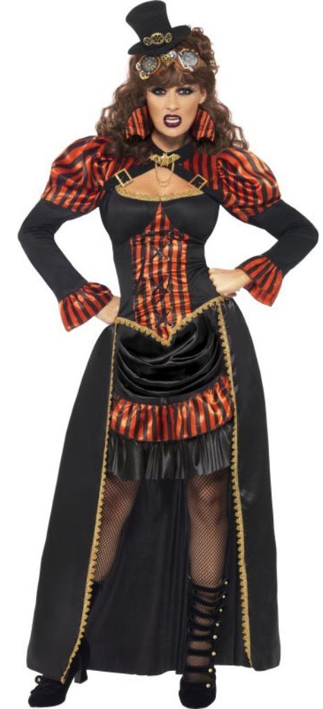 Steampunk Victorian Vampiress costume includes a beautiful red and black hi collared striped dress with gold braiding and buckle and strap detailing around the puffed shoulders and corset style bodice. The back of the dress has a black satin long skirt with gold braiding.