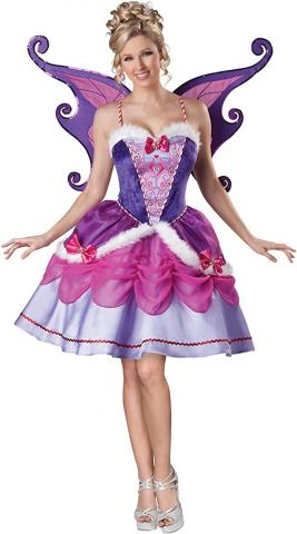 Ladies deluxe Sugarplum Fairy Costume. Included is a satin and panne dress with chiffon and glitter tulle overlays and candy cane trim and embroidered inset bodice.