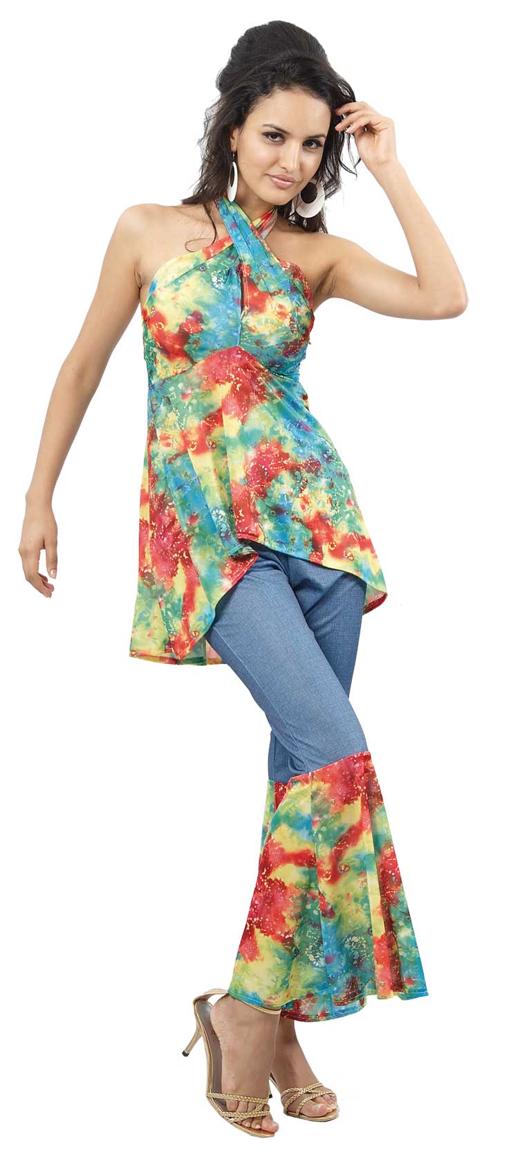 Sunstar Chick Adult Costume features a stylish multicoloured halter top. A pair of matching trousers in blue with colourful flared ends is also included in the costume.