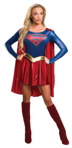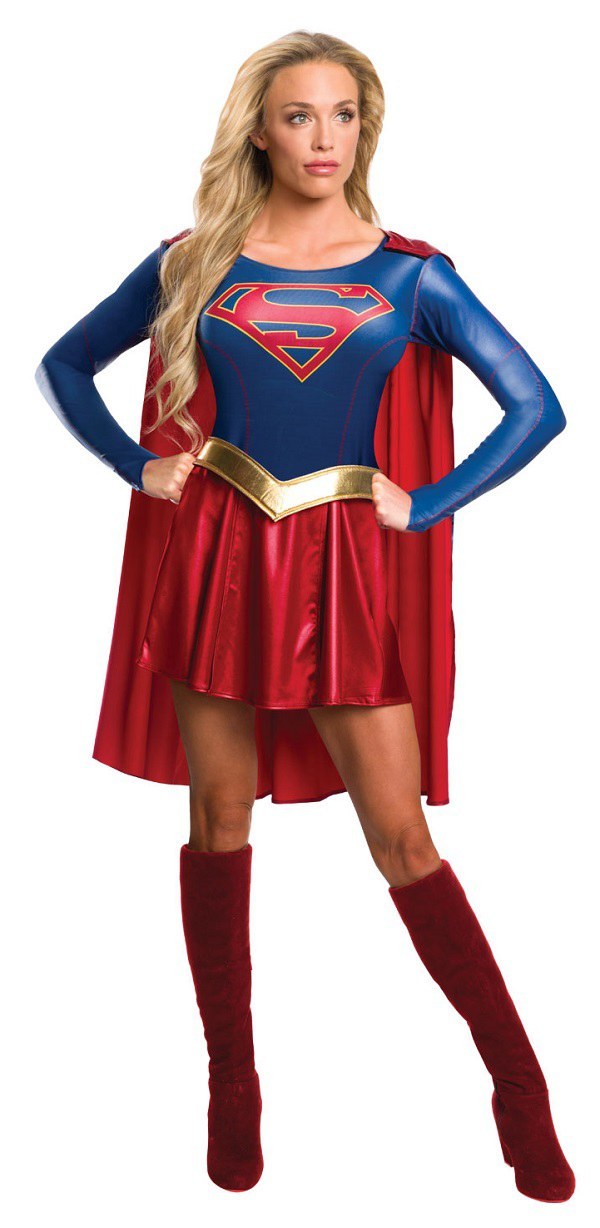 Supergirl costume includes a long sleeved dress with Supergirl logo and a cape.