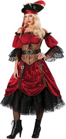 The gorgeous ensemble includes a red off shoulder, mid - length dress with peasant sleeves along with a lace - up brocade vest with black trim. The costume also comes with a tulle and lace petticoat, a matching black belt and a pirate hat with red feather and bandana to complete the pirate look.