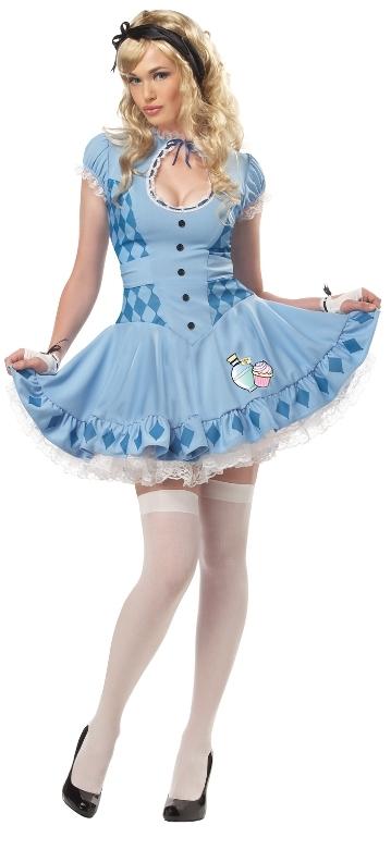 Another fabulous costume from the new Eye Candy range, Sweet Alice includes a baby blue dress with diamond design on the sides and along the bottom of the pleated skirt. The sleeves are puff sleeves with white lace trim. The top of the dress has a cut-out panel, which ties at the collar with a blue ribbon.