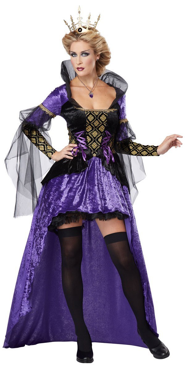 This costume consists of a purple and black hi-low dress with gold detailing on the body, the sleeves also have gold detailing with a sheer purple drape feature starting at the elbow.