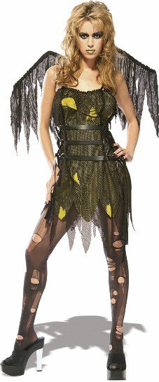 Tinkerspell costume includes a thin strapped mini dress with jagged ends, layer of fishnet lace with rips. Dress also has black straps across the centre and an elasticated trim at the top.