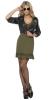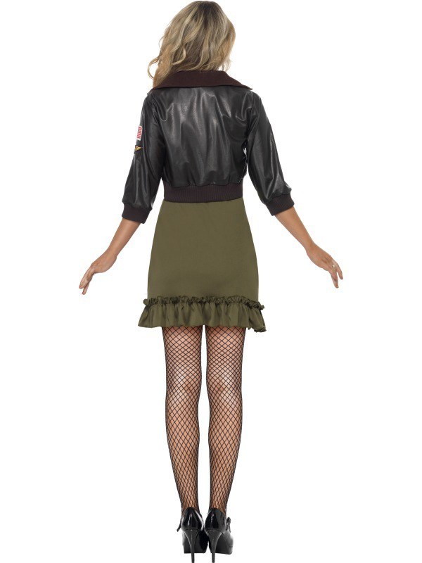 Top Gun ladies costume includes a khaki green dress with collar. Also included is a short brown faux leather bomber jacket with zip to the front, pockets and badges.