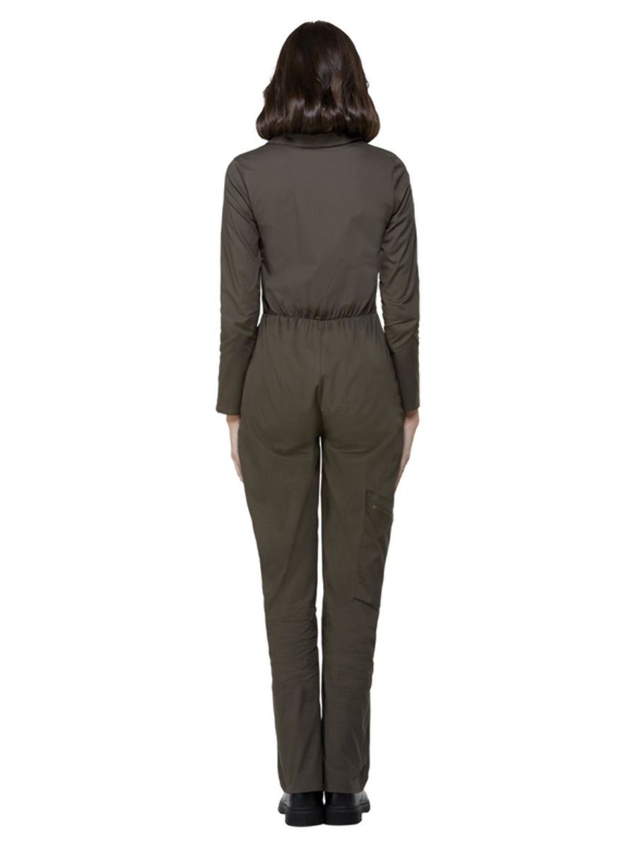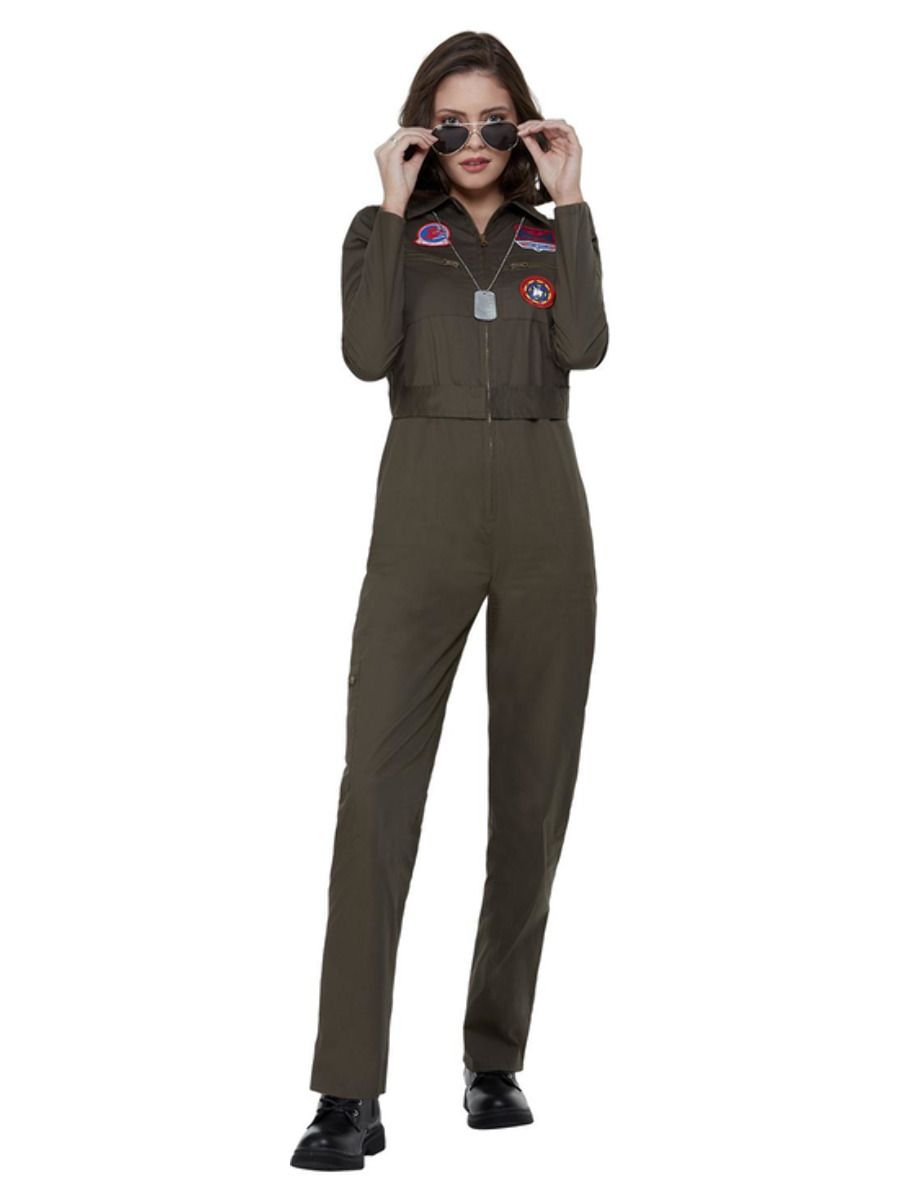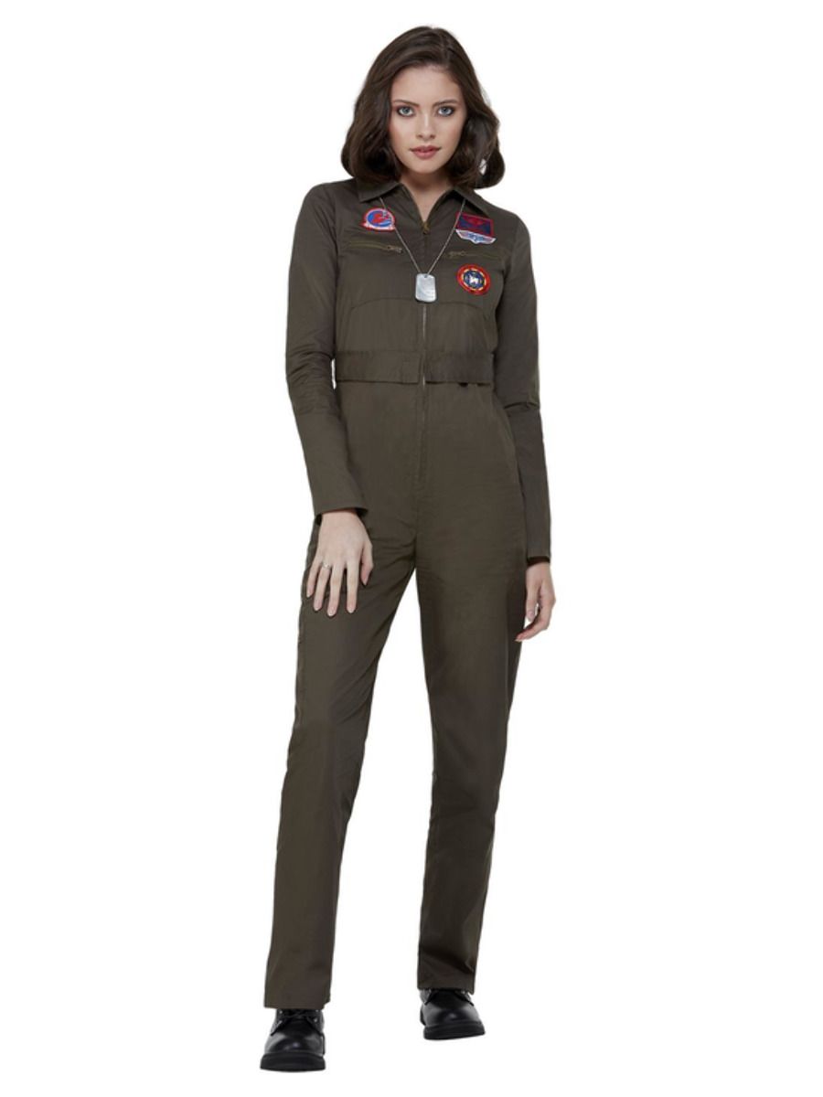 Top Gun Ladies Costume includes green/khaki pilot jumpsuit with numerous badges.