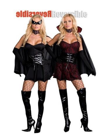 Bring your devilish side to any party with the Twice Bitten Costume. This fully reversible stretch knit vampire/bat dress adorns a sexy vinyl waist corset, winged-shaped hemline, and adjustable straps. One can change in the middle of the night from the red with black lace overlay vampire dress to all black bat dress.
