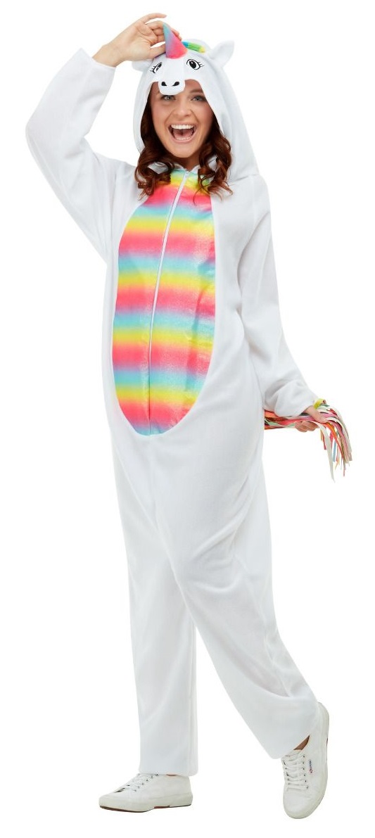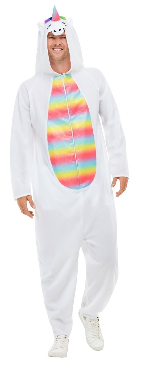 Dress up as everyone’s favourite mythical creature with our Unicorn Hooded Jumpsuit. Costume includes a white all in one zip up front jumpsuit with a rainbow chest. The jumpsuit also features an attached Unicorn head hood and a gold spiral horn with a pink fur mane.