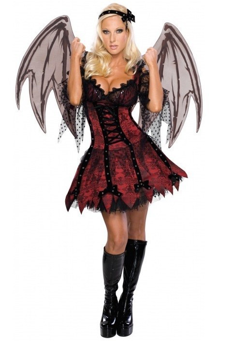 Dark and sinister our Vampire Fairy costume is perfect for your next fancy dress party or Halloween party. Costume includes a red and black short dress with lace sleeves, ribbon tie up to the front. The dress also features lace detailing around the bust line and waist and also included is a black headband.