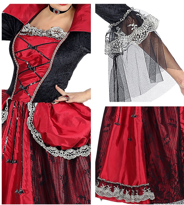 Be an elegant Vampiress this Halloween with our Vampiress Costume. Included in this costume is a long black and red dress with bat applique and silver detailing. This stunning dress features a stand up collar and a mesh overlay.