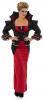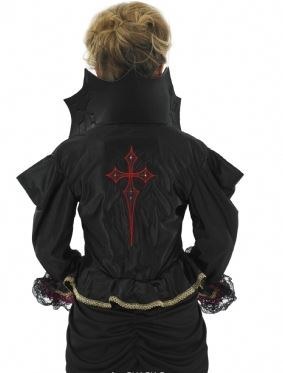 This costume consists of full length red dress, the top of the dress features a red and black lace detail with Victorian style pendant in the middle, a double breasted high-low black jacket with high collar featuring red embroidered crosses on each side and beautifully detailed red ,black and gold cuffs on the jacket.