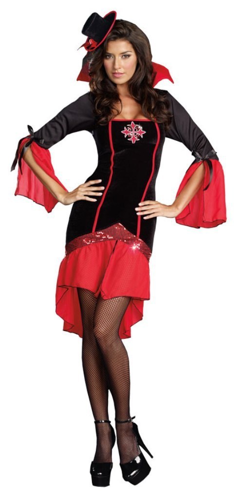 Ladies Vamps Like Us costume includes a velvet and satin black and red dress with sequin detailing and flowing sleeves. The dress also features an attached collar and a Gothic sequin embroidered cross.