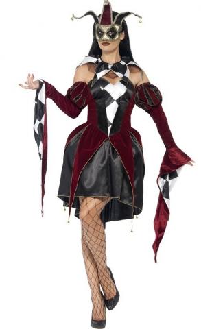 Gothic Venetian Harlequin costume includes a strapless dress with bell detailing and detached sleeves. Also included is a collar.