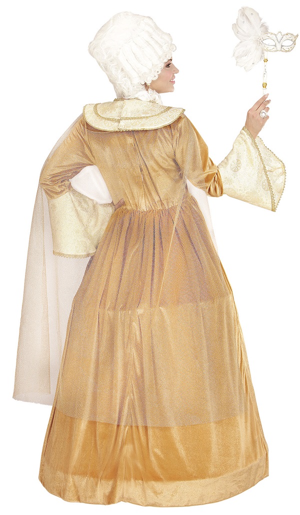 Turn heads at your next fancy dress event with our Venetian Noblewoman Costume. Included in this stunning costume is costume is a floor length gown with a stand up collar, flowing sleeves and glitter detailing. The dress also features beautiful flowing sleeves, bow detailing and an attached jewel. To add volume to the dress an attached crinoline underskirt is also included.