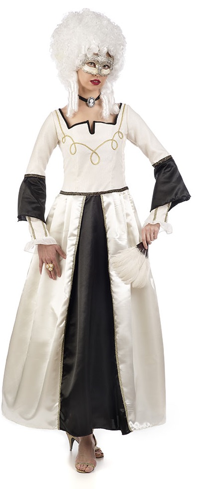 Perfect for masquerade balls. Make a lasting impression at your next fancy dress party or event with our Venetian Woman Giorgia Costume. Included in this stunning costume is a long gown with a satin skirt and a gold and black trim. The dress also features a long flowing sleeves with a lace trim.