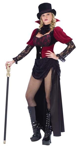 Victorian Burlesque Vampire costume includes a beautiful red and black dress with attached shorts, pretty black lace detail on the chest, sleeves and the back of the dress has a black satin long skirt and a large collar to add to the vampire look.