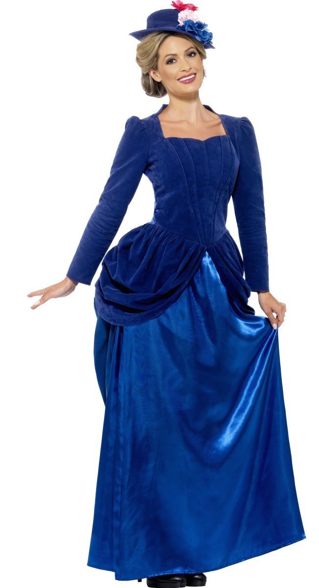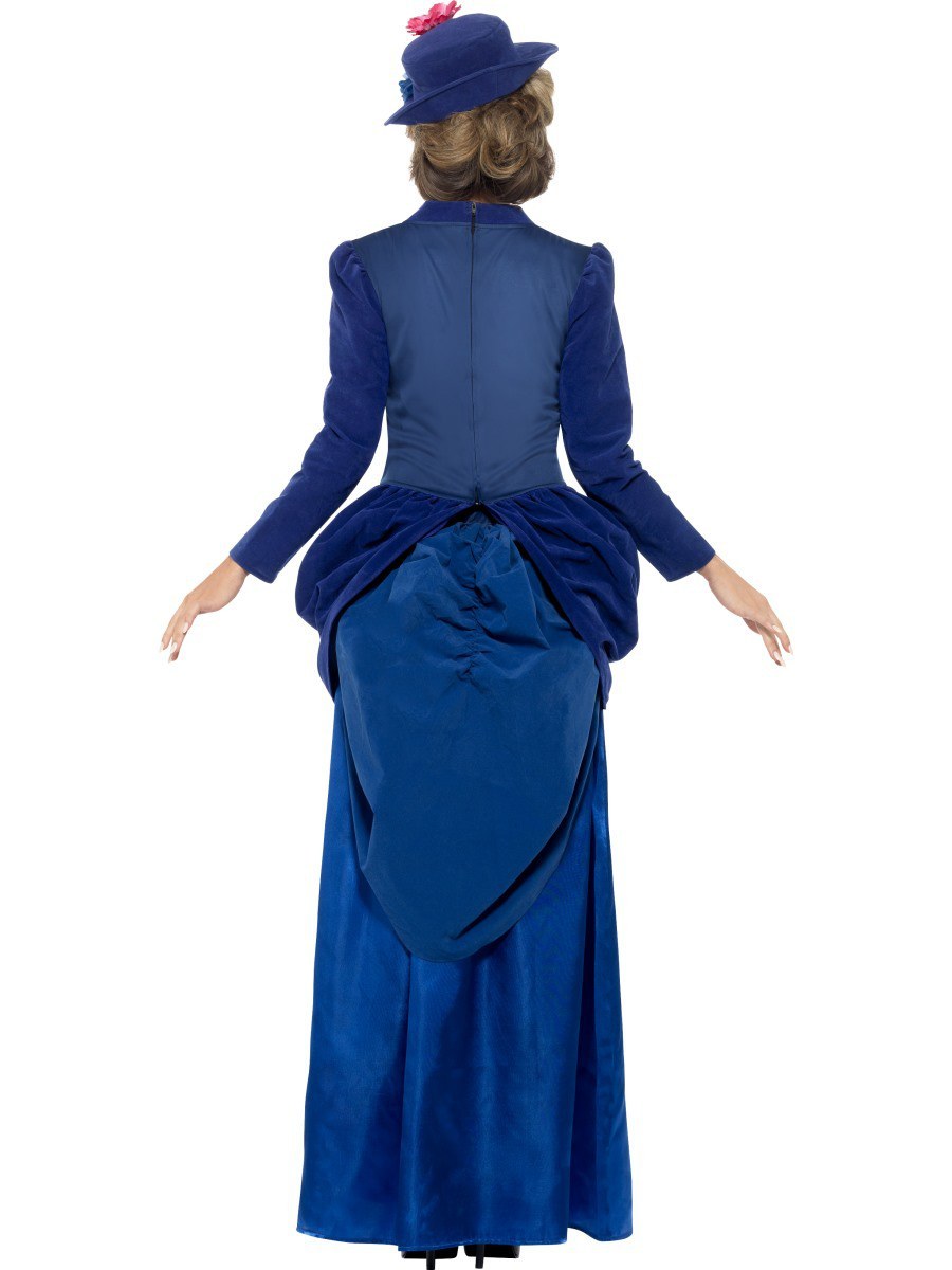 Transform back to Victorian times with this gorgeous blue Victorian top skirt and hat stereotypical of the Victorian times in Old England. The hat features an attached floral piece.