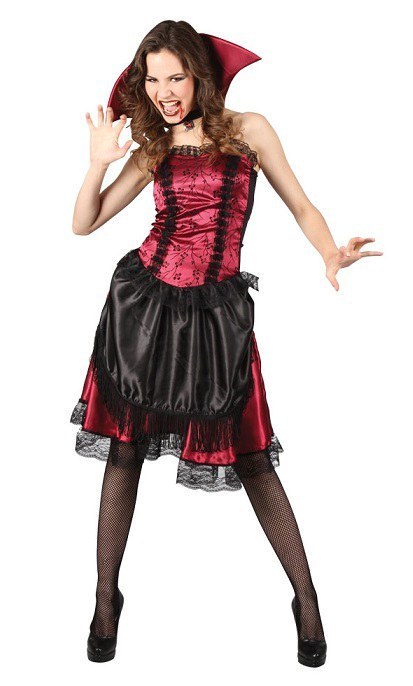 The Victorian Vampiress Ladies Costume features a knee length dress in red and black. The strapless dress has a bodice style top in a wine colour with black lace design and there is an attached skirt in red with a black apron style over skirt. The trim of the skirt also has a elegant lace trim. To complete the Victorian Vampiress costume, the costume also features a stand up collar with choker.