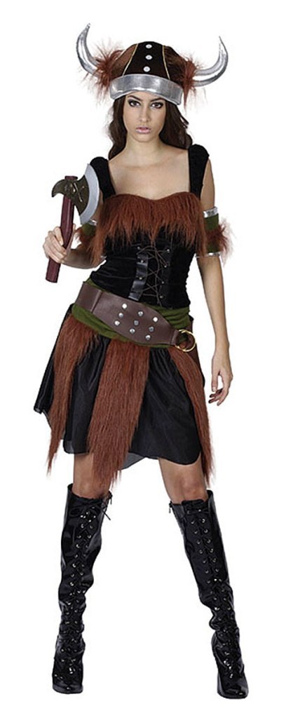 Ladies Viking costume includes a brown top with bown faux fur and a brown skirt. Also included is a studded belt and a pair of arm bands. To complete the look a matching hat is also included.