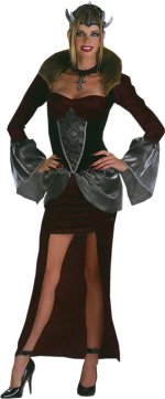 The Viking Queen Costume includes sexy burgundy dress with charcoal bodice detailing and flared sleeves. Choker and metal look viking headpiece also included.