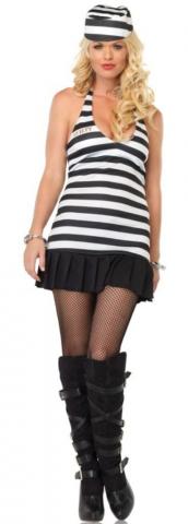 Wardens Mistress costume includes black and white striped halter neck dress with black pleated skirt. A pair of toy handcuffs and a matching hat are also included.