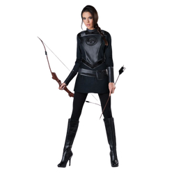 A true master of stealth, this fashion forward huntress looks sleek and sexy in an all black ensemble featuring a dress with printed emblem on the bodice and belt with satchel.
