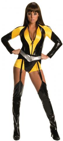 From the famous Watchmen movie our Silk Spectre costume includes a yellow and black PVC/Lycra romper with garters and frontal zip closure. Also included is a pair of black PVC boot tops and a silver plastic belt with velcro closure.