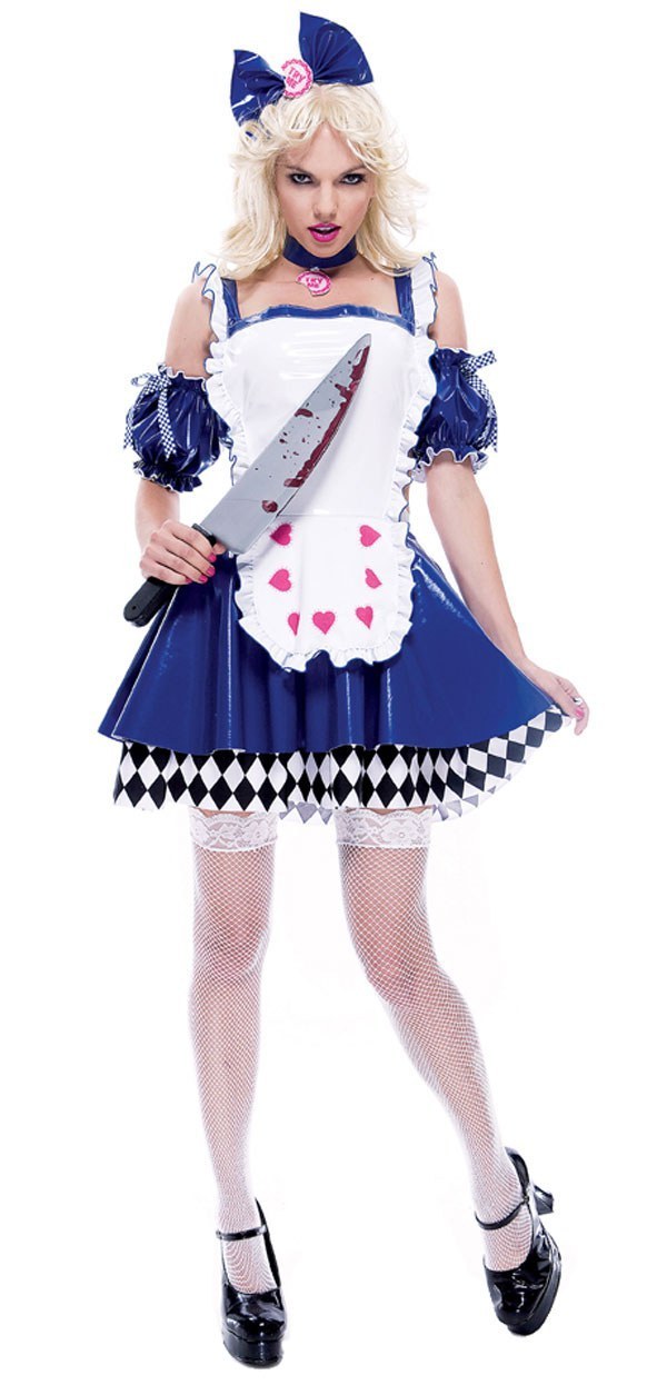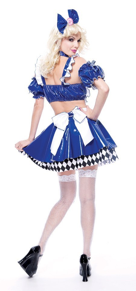 Wicked Alice Costume includes a blue and white short dress. This dress has blue arm puffs and has an apron attached.