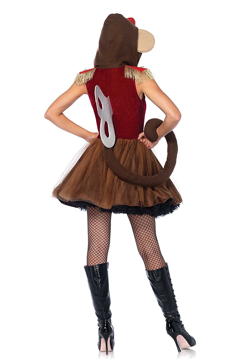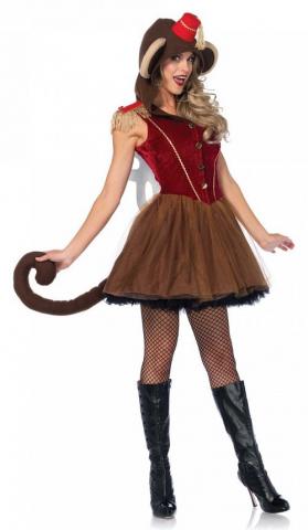 Wind Up Monkey costume includes a dress with a velour top and petticoat skirt. Also included is a fleece monkey ear hood and an attached fez hat.