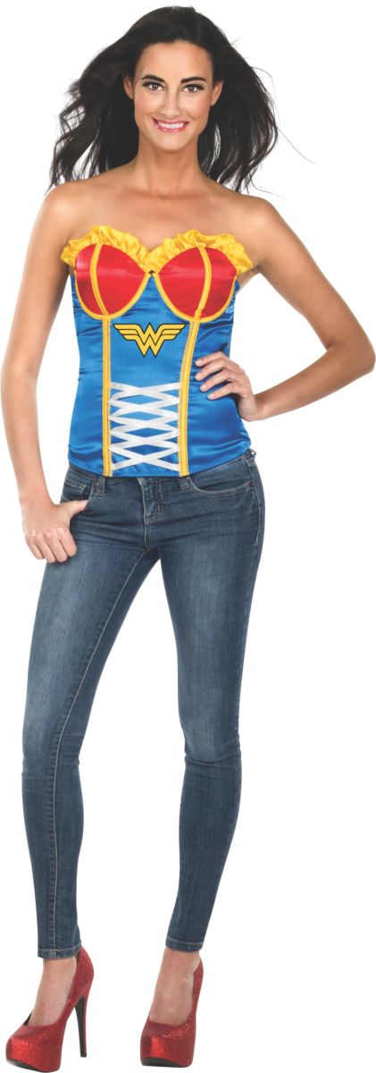 Included is a blue, red and yellow corset with a Wonder Woman logo patch stitched to the front.