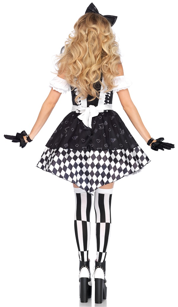 Be tea party ready with our Wonderland Alice Costume. Included in this fairytale costume is a black and White storybook print high/low dress with ruffle trimmed clock apron and a matching bow headband.