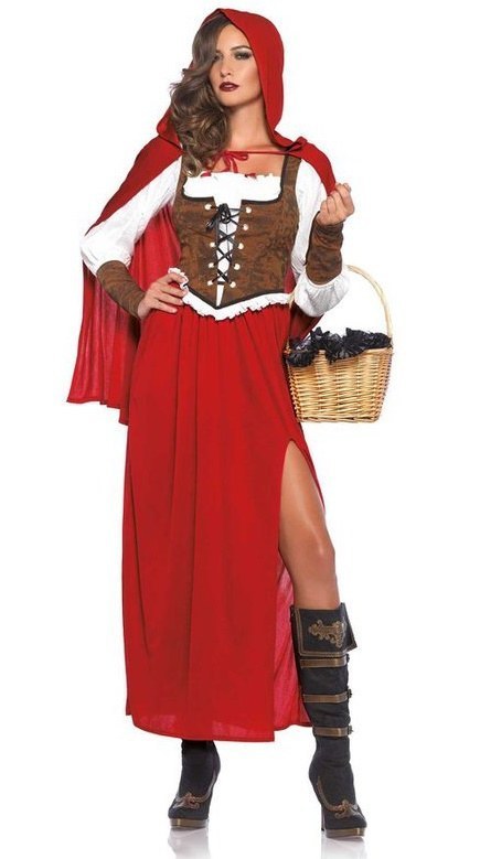 Woodland Red Riding Hood Costume includes a long high slit dress with faux leather lace up bodice and a pair of matching wrist cuffs. To complete the look a red hooded cape is also included.