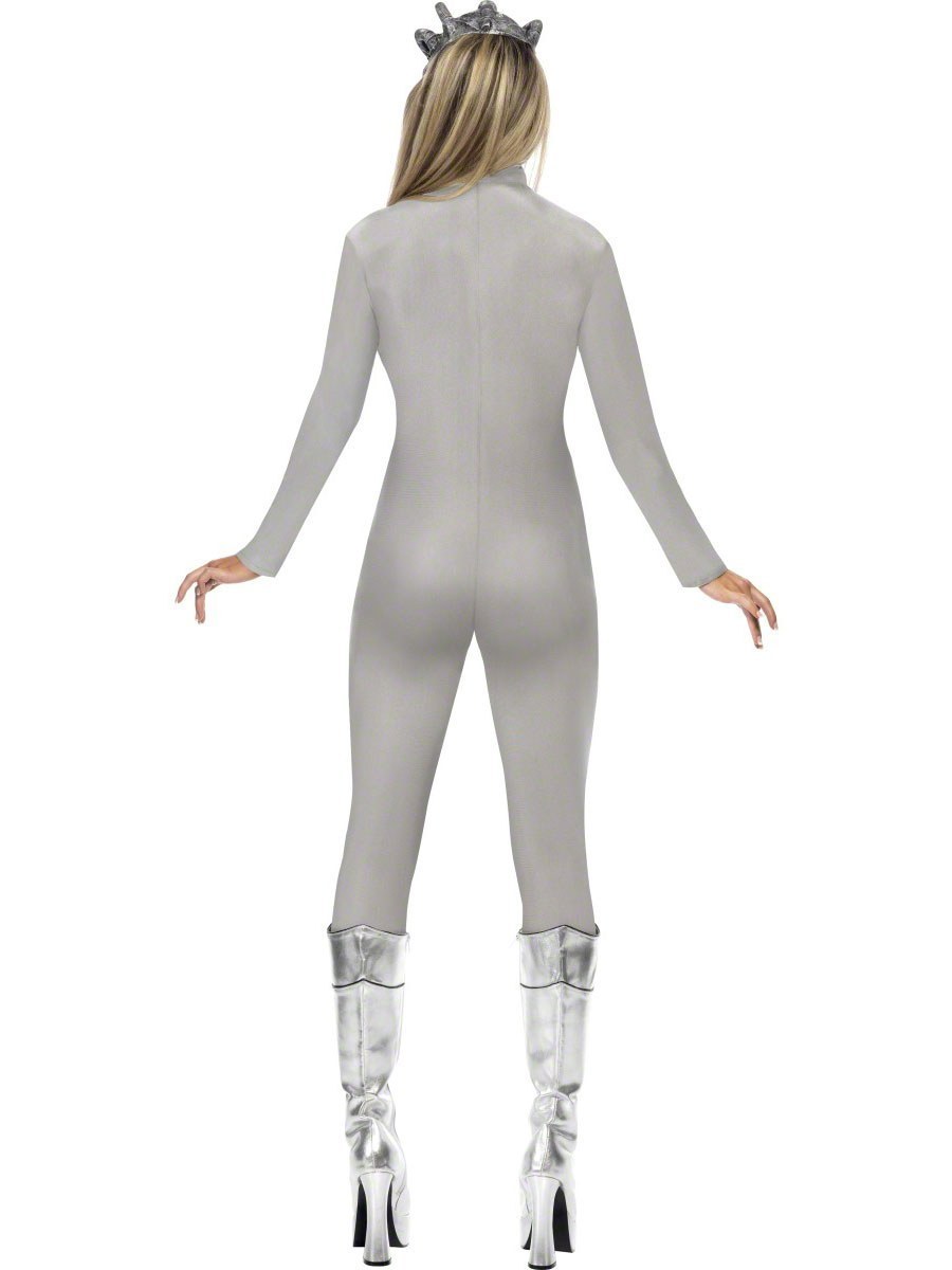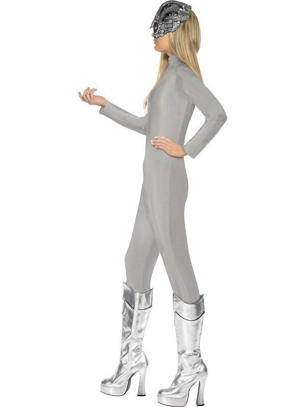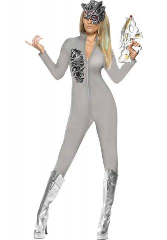 Robotic Sci-Fi Fantasy Costume is a full grey body suit with robotic detail print and half face mask. Made from lycra to make it tight-fitting. To complete this robotic look a half face mask is also included.