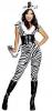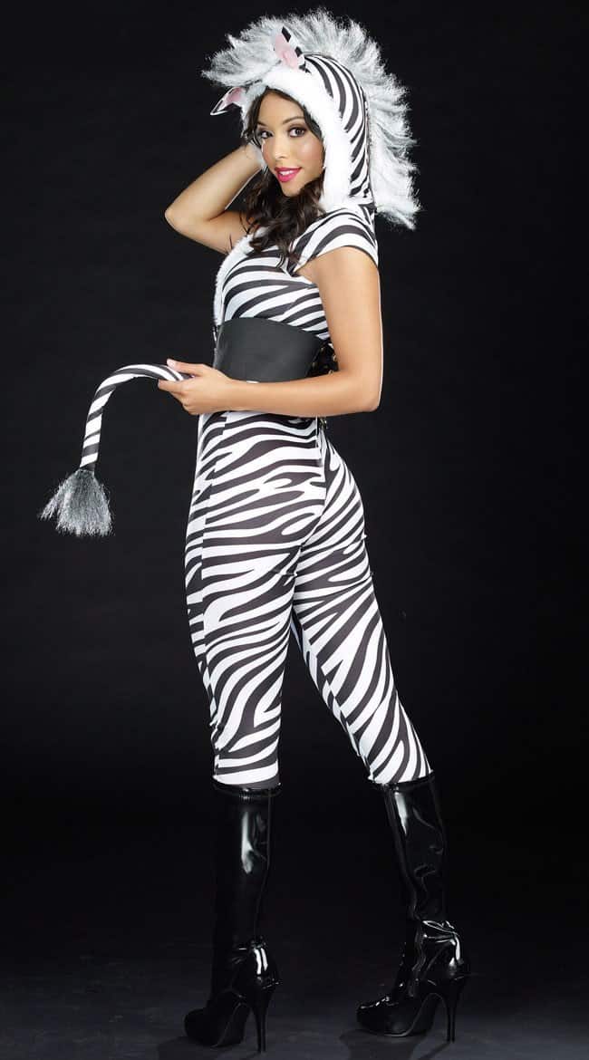 The sexy Zebralicious Costume features a stretch, zebra print cat suit with faux fur trimmed attached hood. The hood also has attached ears and white and black mohawk style mane.