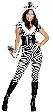 To complete the eye catching look a flattering waist cinching boned corset with stud detail and a matching removable zebra tail are also included.