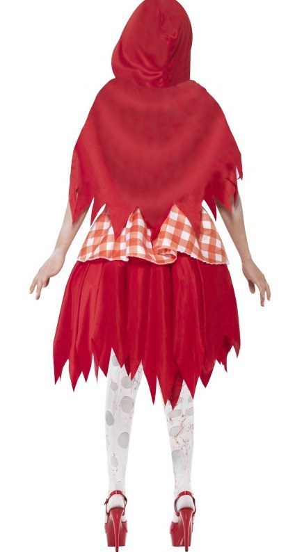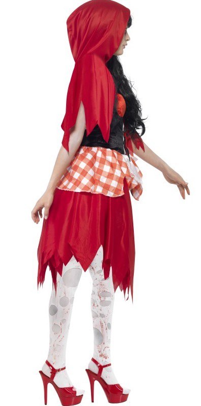Zombie Hooded Beauty costume includes a dress with halter neck top and a red hooded cape.