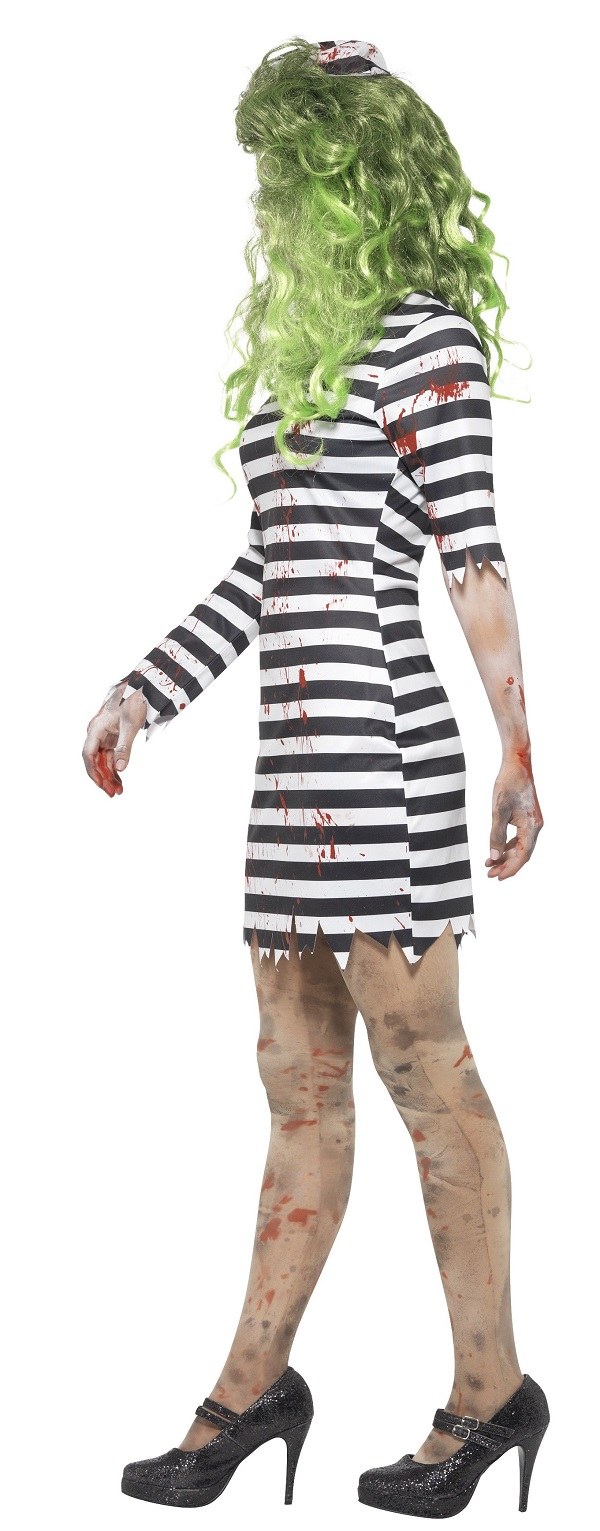 Zombie Jail Bird Costume includes a black and white striped dress with blood print and a matching hat.