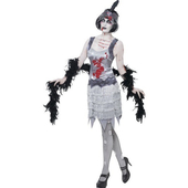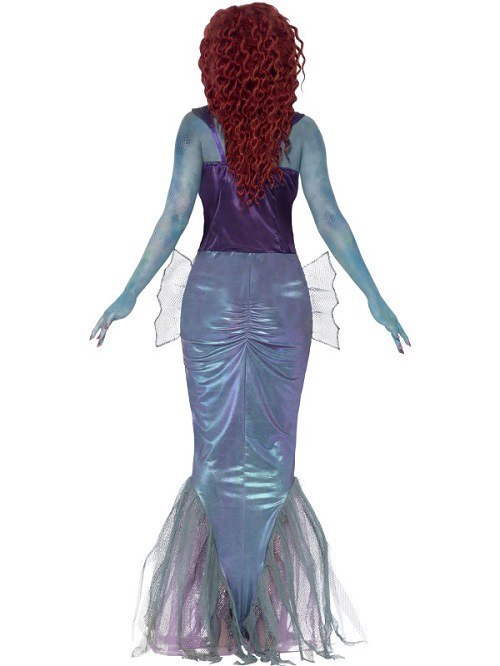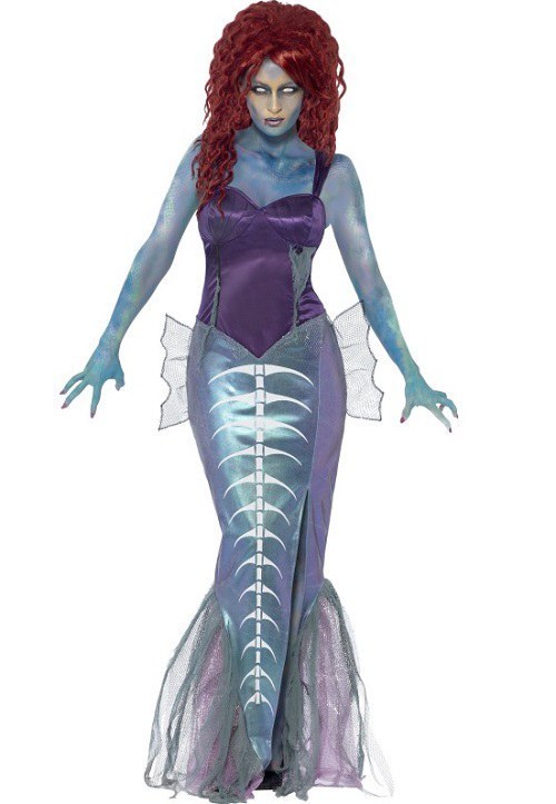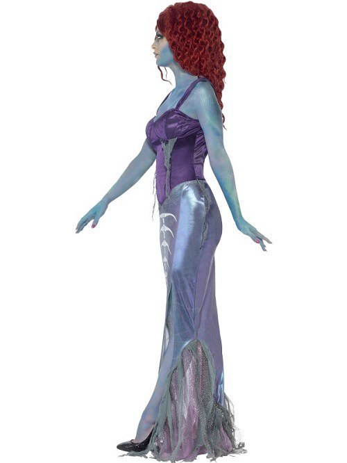 Zombie Mermaid costume includes a purple top with black sequin and green mesh detailing. Also included is a printed skirt with side slits and mesh detailing.