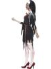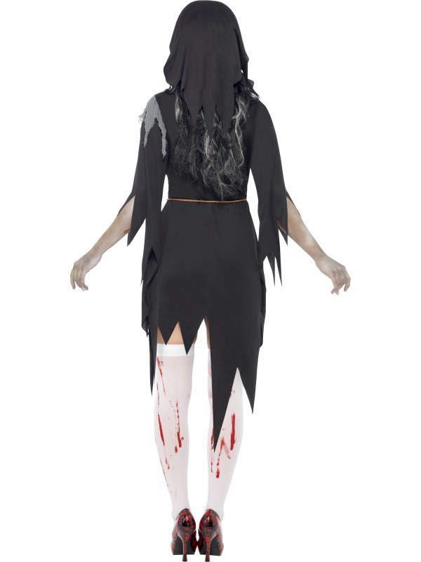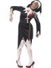 Zombie Nun costume consists of black dress which features jagged ends an attached latex wound,and a rope belt.